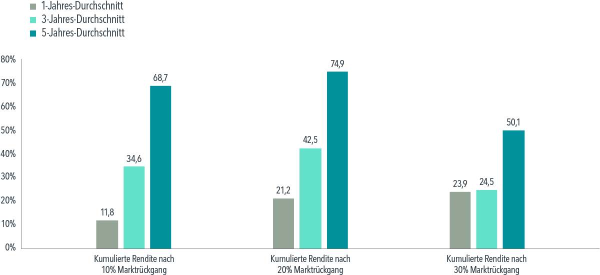 Der Schmerz, den Sie jetzt spüren, zeigt, dass die Märkte die Preise so setzen, dass die erwarteten Renditen immer positiv sind. Die nachfolgende Abbildung veranschaulicht, dass die Marktrenditen nach Abschwüngen normalerweise positiv sind. Betrachtet man die Renditen von US-Aktien nach Abschwüngen von 10%, 20% oder sogar 30%, so sind die folgenden kumulierten Ein-, Drei- und Fünfjahresrenditen im Durchschnitt positiv.