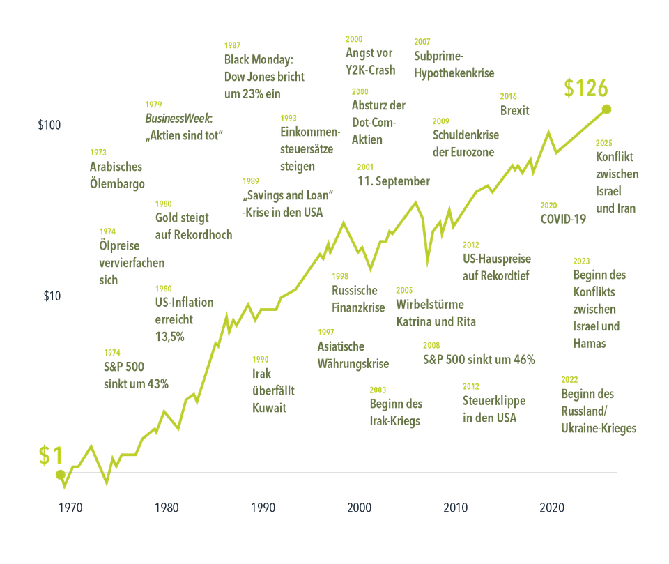 Langfristig zu investieren bedeutet zwangsläufig, politische und wirtschaftliche Ereignisse zu überstehen, die zu Marktturbulenzen führen können. In den vergangenen mehr als 50 Jahren haben Anleger zahlreiche Herausforderungen erlebt, darunter zweistellige Inflationsraten, Finanzkrisen und eine globale Pandemie. Doch die Märkte haben ihre Resilienz immer wieder aufs Neue bewiesen und gezeigt, dass sie sich kontinuierlich an neue Informationen anpassen können und Disziplin belohnen. Hätte man im Jahr 1970 einen US-Dollar in den MSCI World Index investiert, wären daraus bis zum 24. Juni 2025 126 US-Dollar geworden – trotz zahlreicher Krisen während dieser Jahre. Wer auf kurzfristige Turbulenzen reagiert, läuft dagegen Gefahr, diese längerfristigen Renditen zu verpassen.