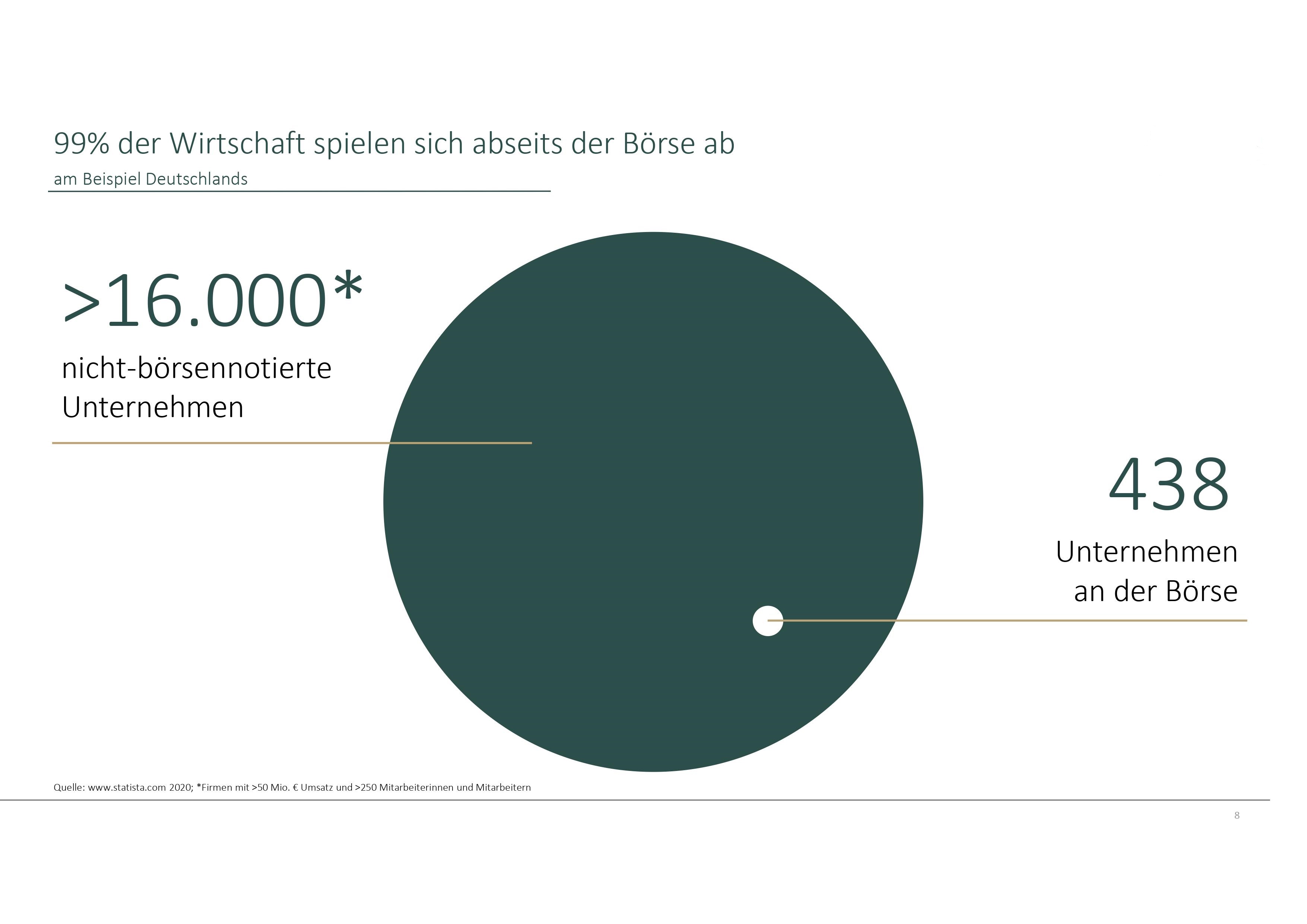 Leider ist nur wenigen Menschen bewusst, dass ein Großteil der Firmen gar nicht börsennotiert ist. Laut Statistischem Bundesamt gibt es allein in Deutschland ca. 3,4 Mio. Unternehmen. Davon sind an der Deutschen Börse nur ca. 450 notiert und damit für Geldanleger investierbar.
