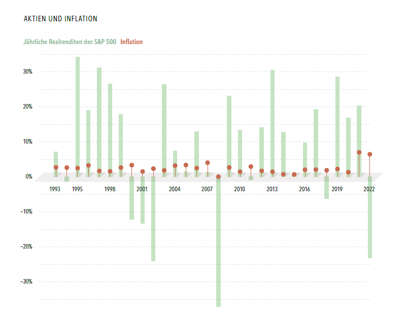 Wie in der beigefügten Grafik erkennbar können Aktienrenditen bei höherer Inflation mal stärker, schwächer oder moderat ausfallen. So waren die Renditen im Jahr 2021 beispielsweise relativ hoch, im Jahr 2022 jedoch niedrig. Obwohl in beiden Jahren eine starke Inflation herrschte.